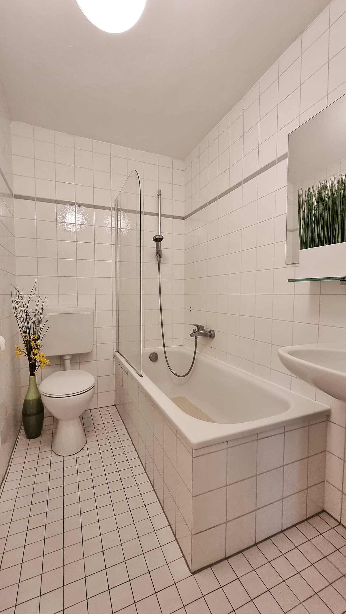 Helle Zimmer durch sonnige Ostausrichtung und großen Fensterflächen, praktischer Eingangsbereich, weiß gefliestes Bad mit Badewanne, moderne Einbauküche mit Edelstahlapplikationen