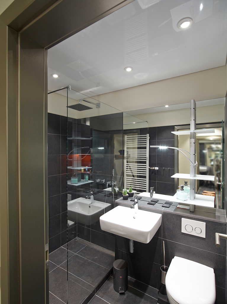 mit beleuchteter Wandaussparung für Shampoo o.ä. Auch hier eine Hochglanzdecke mit Downlights.