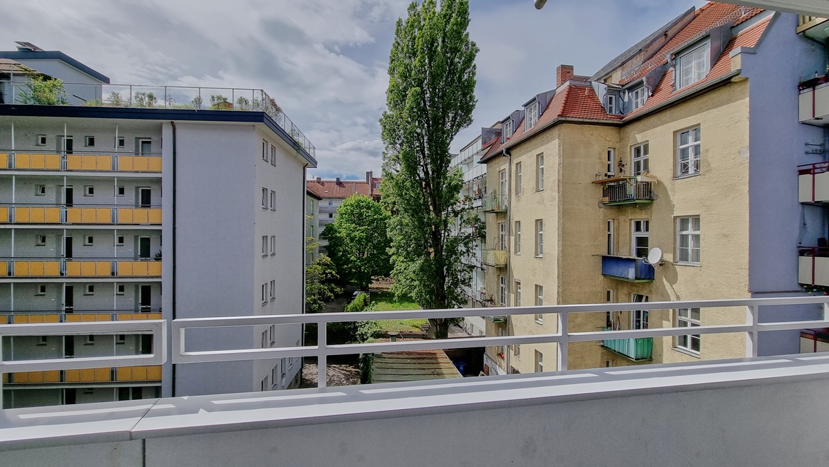 Großer ruhiger Westbalkon in den Innenhof mit weiter Sichtachse.