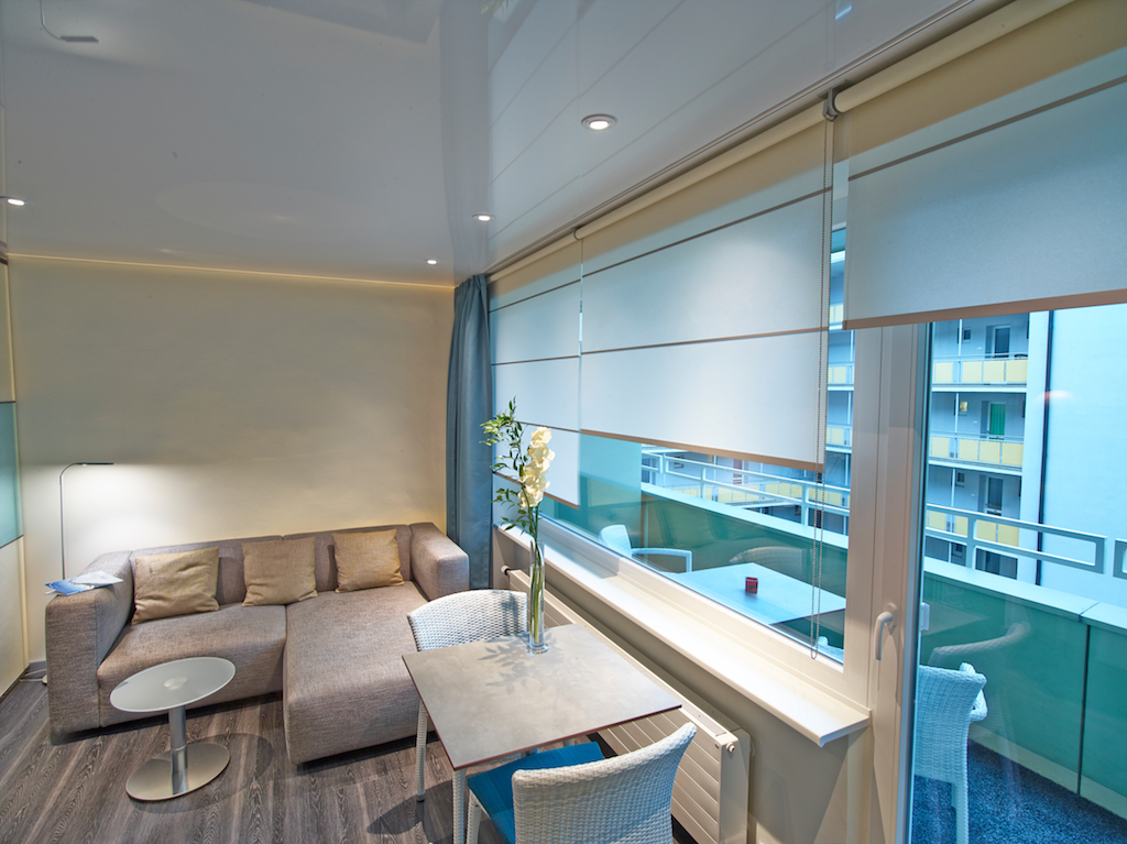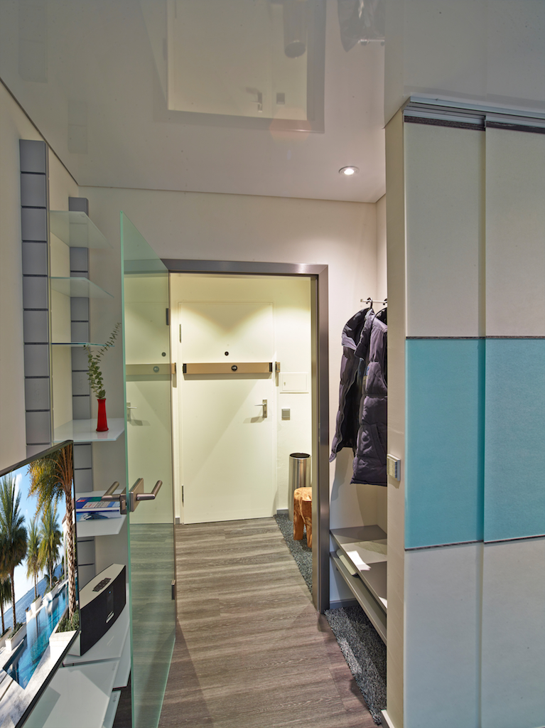 Die Hochglanz-Decke verfügt über Downlights und ist per modernem Bus-System steuerbar.